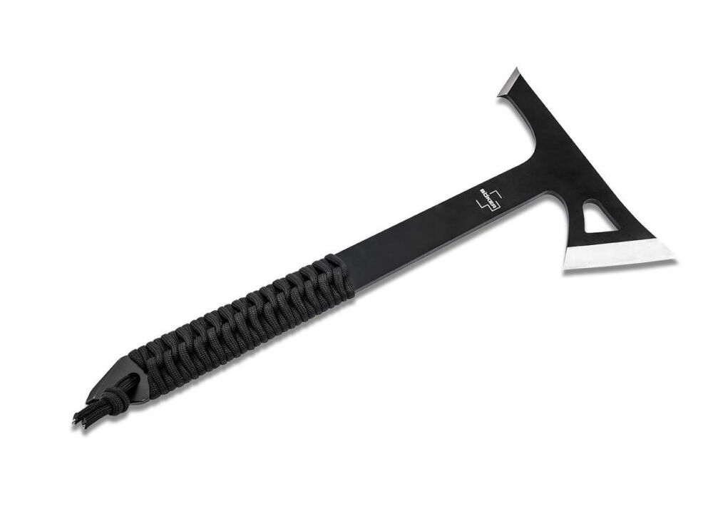 Für den großen Wurf – Das Böker Plus Mohican Wurfaxt 3er-Set richtet sich gleichermaßen an Einsteiger als auch an geübte Werfer des beliebten Sports. Die Gründung der International Axe Throwing Federation (IATF) und die Etablierung als Kneipensportart (insbesondere in Belgien und Polen) zeigt die Anziehungskraft des Axtwerfens. Die Ganzstahlkonstruktion aus rostfreiem 3Cr13 ist mit einer schwarzen Beschichtung versehen. Die Formgebung der Axt ist an die Silhouette traditioneller Tomahawks nordamerikanischer Urvölker angelehnt und wartet mit einer zusätzlichen, kürzeren Schneide am Axtkopf auf. Für die nötige Präzision beim Axtwerfen sorgt der mit Paracord umwickelte Griff, der angenehm und sicher in der Hand liegt. Die glockenförmige Aussparung an der Klinge garantiert eine ausgewogene Balance bei gleichmäßiger Rotation. Für den Heimvorteil wird das Wurfbeil-Set mit passender Scheide sowie gedruckter Zielscheiben-Auflage ausgeliefert.