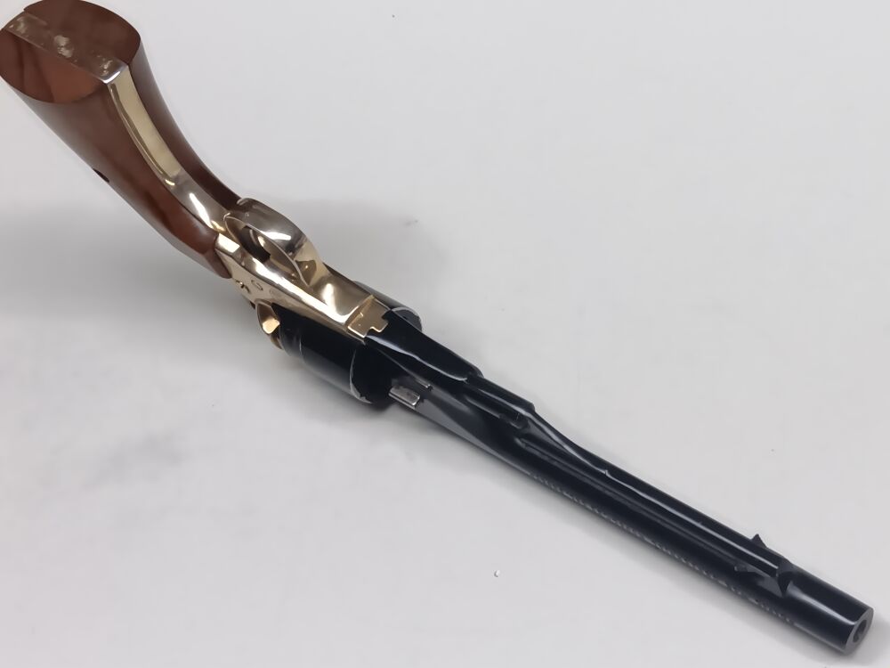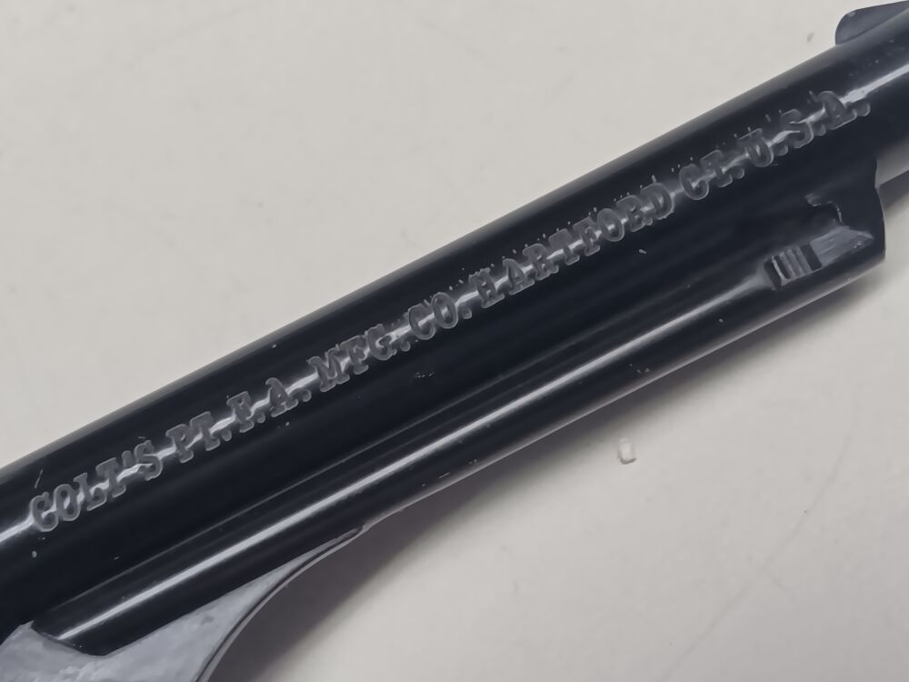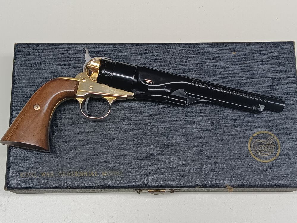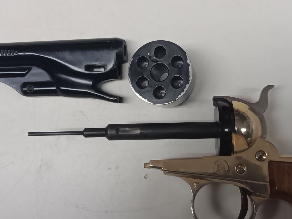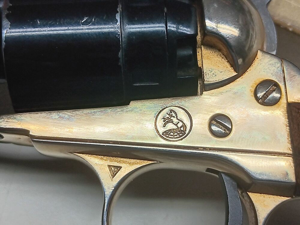 Einzelladerpistole im Maßstabverkleinerten Perkussionsrevolver- Look , Gesamtlänge 26 cm , Visierlänge 20 cm , starre Visierung , Single-Action Abzug , " Trommel " mit einem Patronenlager und 5 frontseitigen Blindbohrungen , zum Laden muß der Lauf nach vorne abgezogen werden , System funktioniert einwandfrei , Rahmen und Laufmantel sind aus schwerem Druckguss gefertigt , Innenlauf und Trommel aus Stahl , der 153 mm lange Lauf ist innen blank , die ansonsten vollständige Originalbrünierung ist am Trommelrand abgerieben , die originale Rahmenvergoldung ist am Griffrücken berieben , originale Colt-Fertigung aus den 1960er Jahren , kein gültiger Beschuß vorhanden, daher Abgabe ausschließlich an Sammler/Sachverständige und WHL.