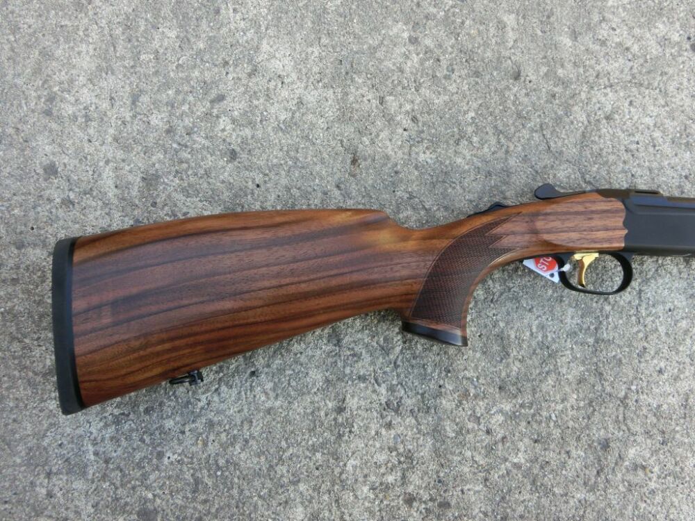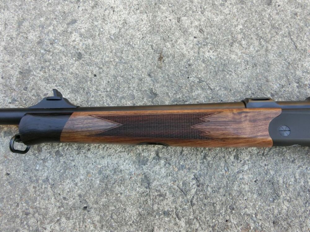 Pistolengriff, Vorderschaft und Patentschnäpper sind edel mit Ebenholz abgeschlossen. Der Hinterschaft der Schaftholzklasse 4 gestaltet sich mit abnehmbaren Riemenbügeln und mit bayerischer Backe und Doppelfalz.