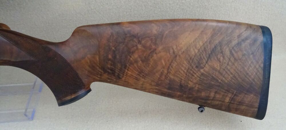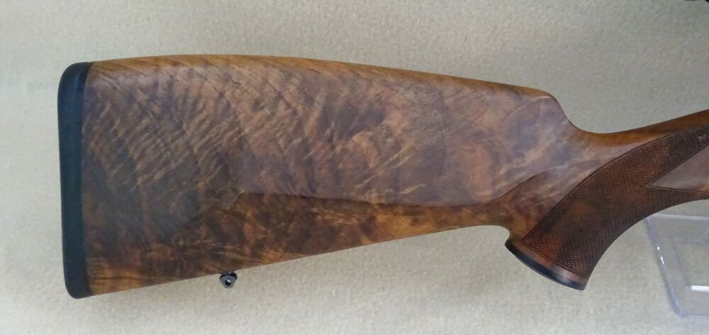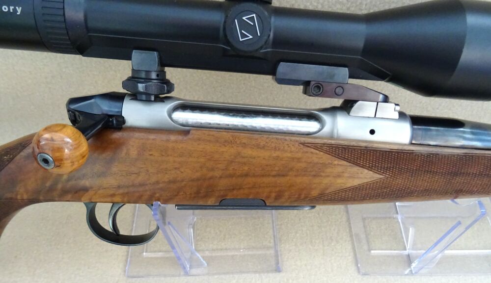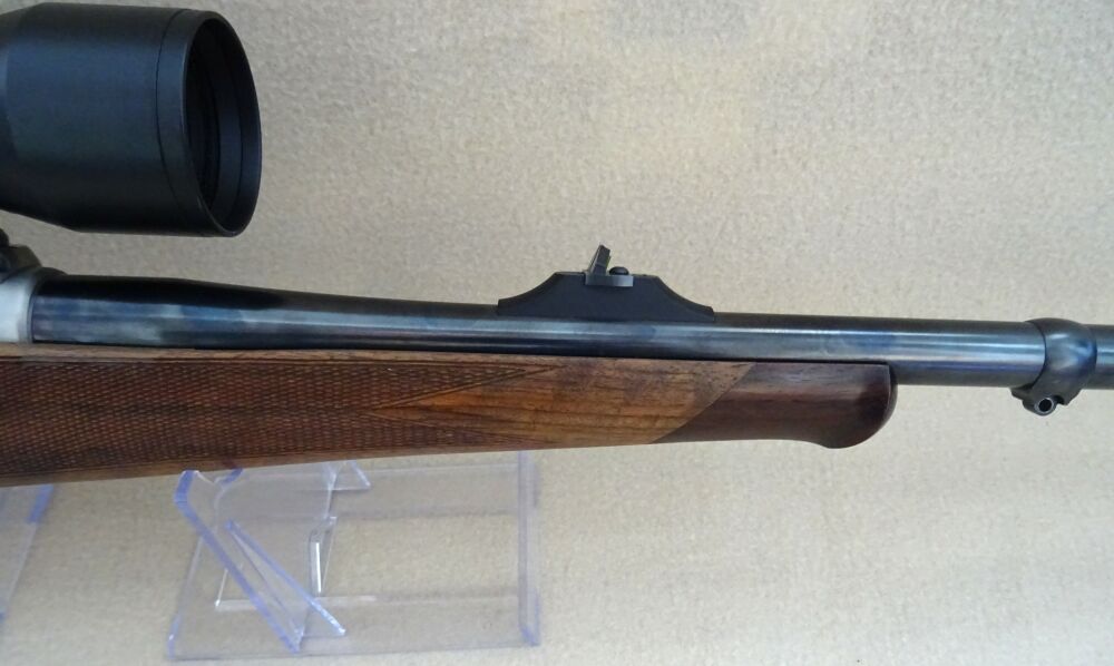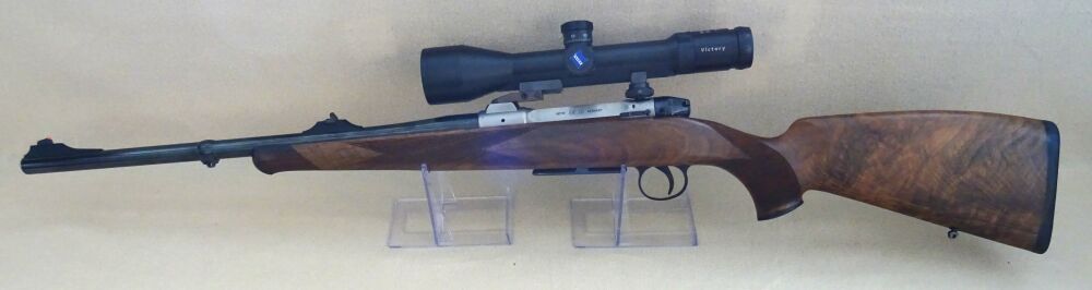 Der Repetierer des Hersteller Heym, Mod. SR30 im Kal. 8,5 x 63 R Reb ist in einem Nussbaum Holzschaft mit leichtem Schweinsrücken und Bayerischer Backe gearbeitet. Auf der Waffe ist ein ZF des Hersteller Zeiss.