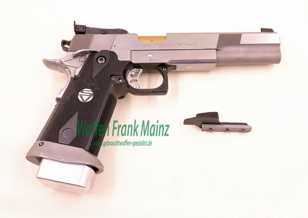 aus Sammlungsauflösung, wenig geschossen, Stainless-Ausführung, Griffstück Polymer, mit 20+1 Schuss Magazin mit Aluboden (weitere ab Lager lieferbar), einstellbarer Abzug, Hahn und Magazinhebel skelettiert, verstellbares Aristocrat-Matchvisier in dreifacher Positionierung, mit original Schuemann Ultimatch/AET Lauf in goldfarbener Plasmabeschichtung, mit zusätzlich abschraubbarer, linksseitiger Daumenauflage......der Formel 1 Porsche für den IPSC-Schützen....