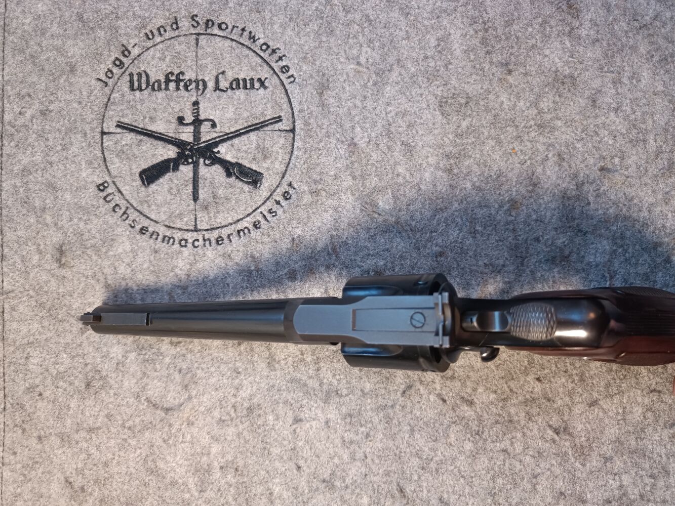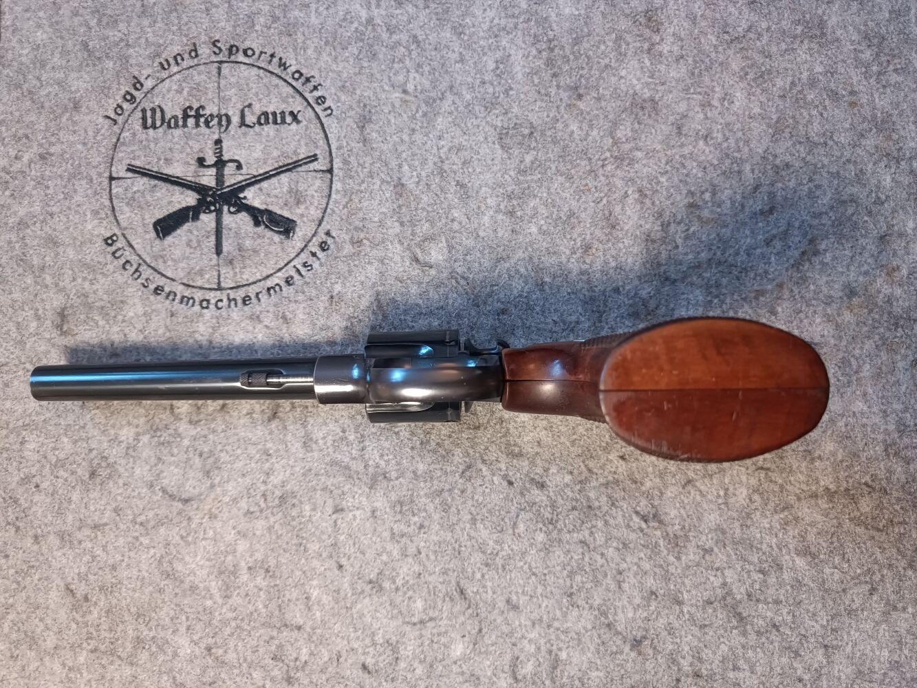 Die Waffe hat wenig Gebrauchsspuren. Nur vereinzelnd leichte Druckstellen am Holzgriff. An der Brünierung sind leichte helle Ablagespuren an der Mündung und ein leichter feiner Kratzer am Trommelarm zu erkennen. Technisch ist er in einem sehr guten Zustand und wenig geschossen.
