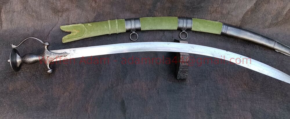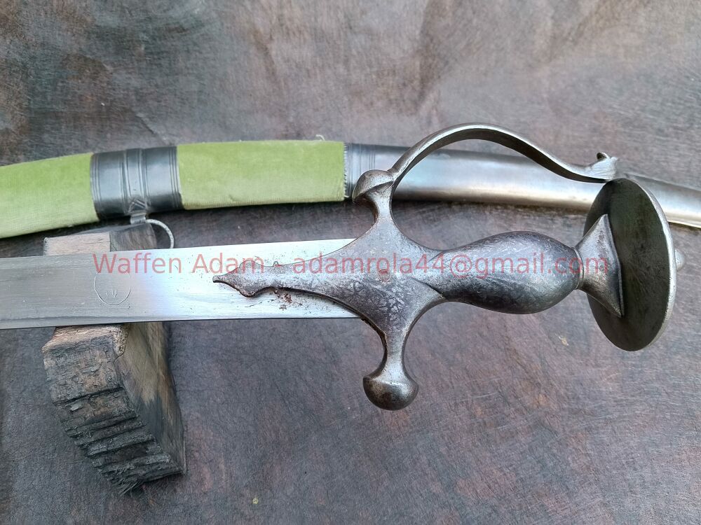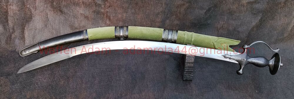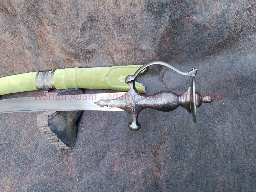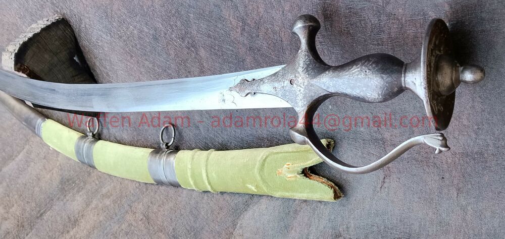 Sehr sauber gearbeiteter Krummsäbel aus Sammlung, schwere Klinge mit versch schwach leserlichen Markierungen / Inschriften. Vorne auf ca. 10cm Fehlschärfe. Klinge teilweise mit feinen Närbchen.