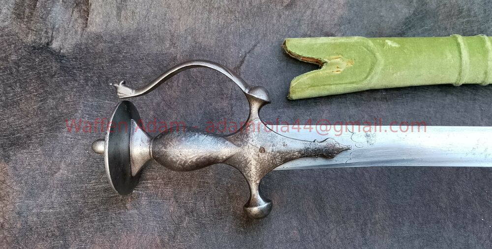Drachengriff, Scheiben- Griff mit der für diese Waffen üblichen Ausarbeitung aus Ganzstahl, mit großem eleganten Abschluss (Knauf). Insgesamt sehr schöne Erhaltung. Seltene Original Waffe aus dem 19 Jht bzw. frühen 20 Jht. Gesamtlänge 95cm, Klinge 80 cm, Griff ca. 12cm.