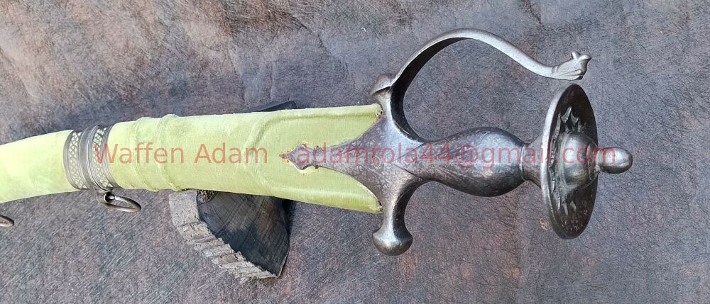 Bezogene Scheide aus lindgrünem Samt / Leder?, diese mit Metallabschluss und durchbrochenen Hängerbändern und Trageringen. Scheide schwergängig.