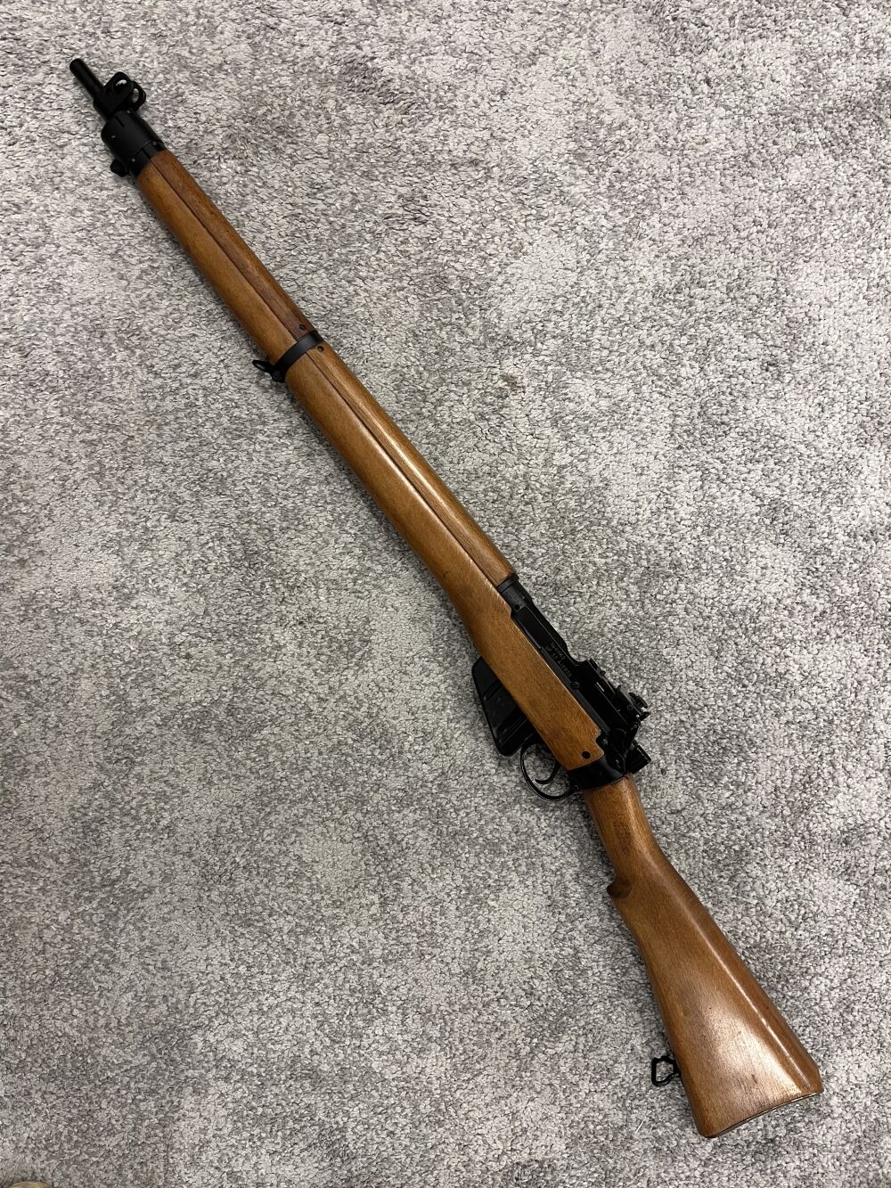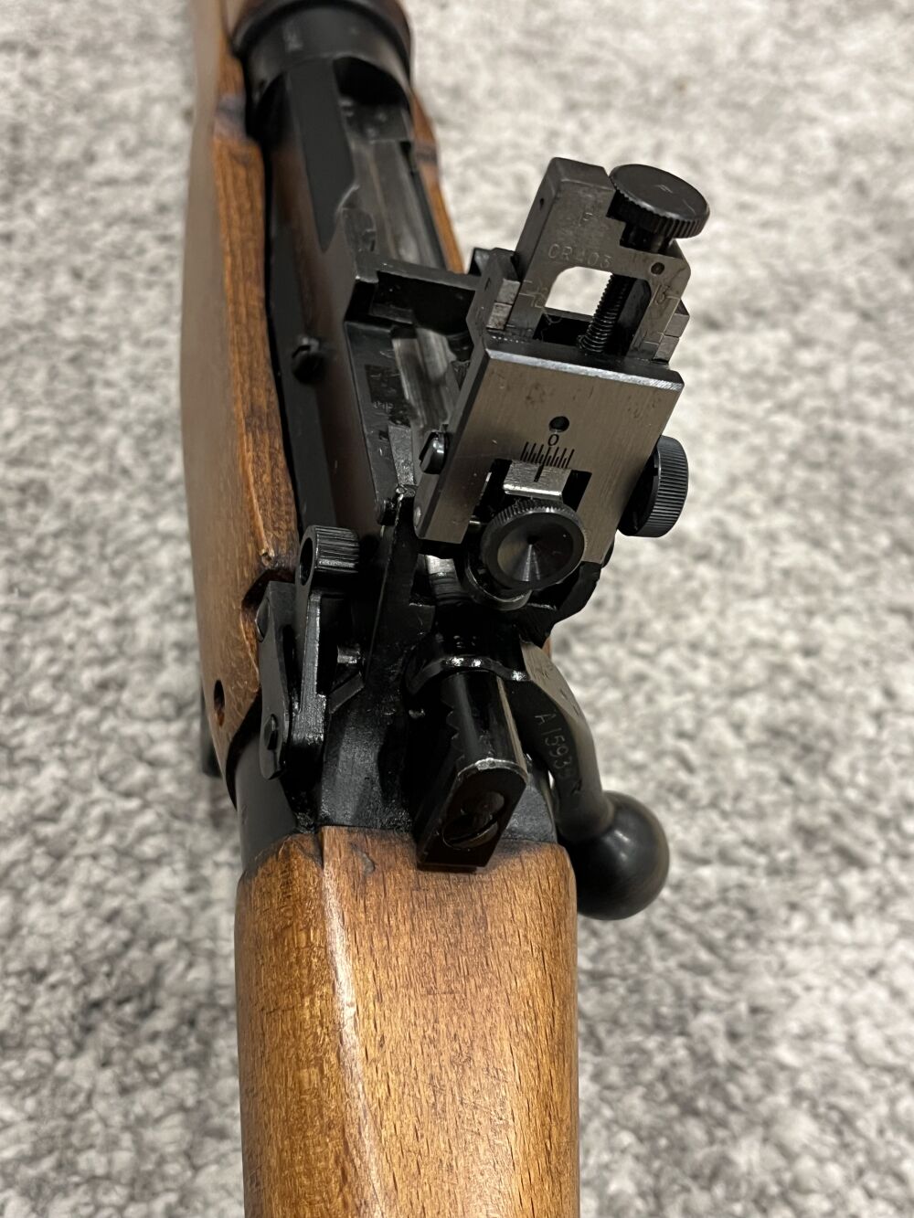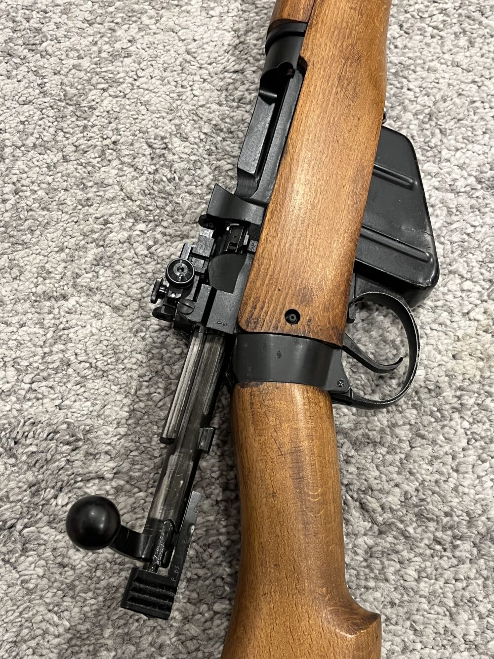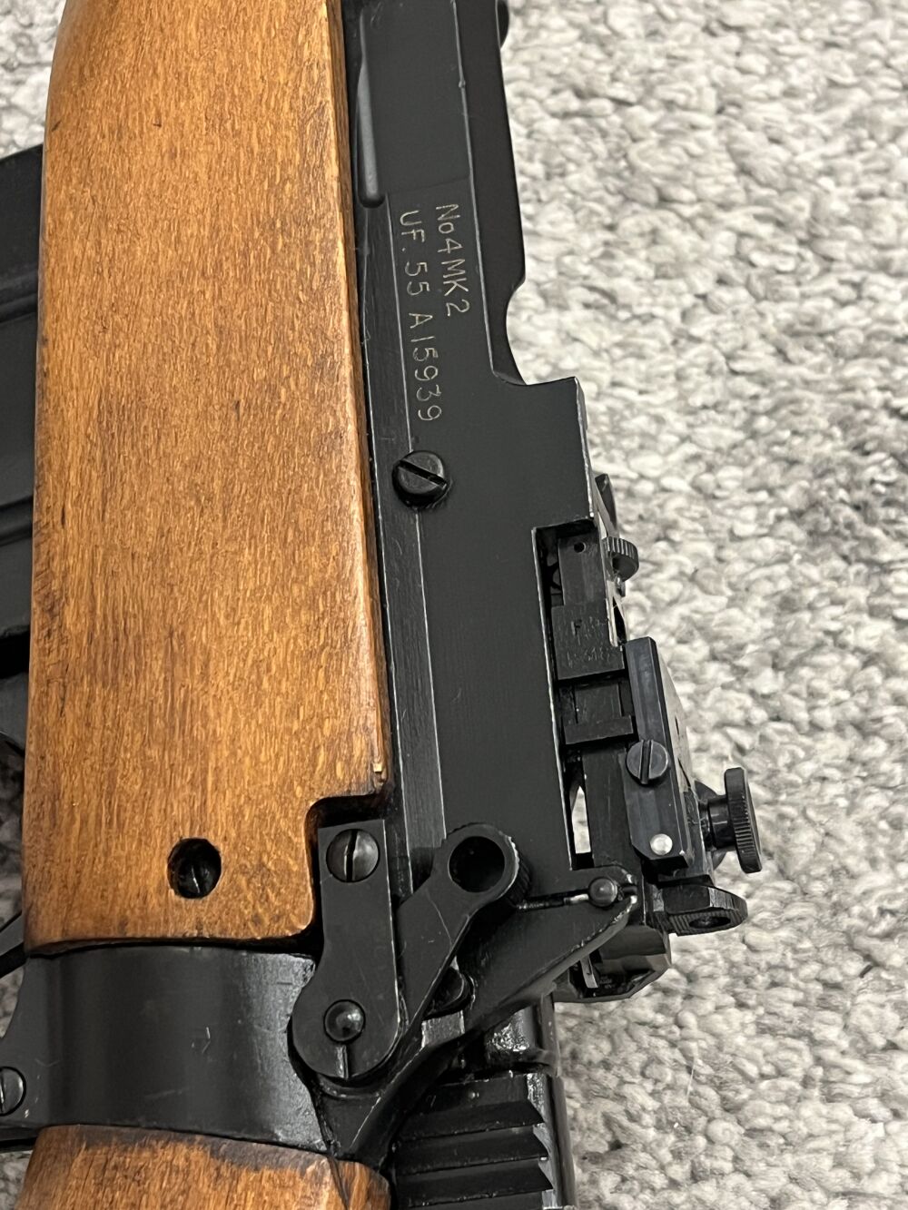 Zum Verkauf kommt ein Enfield No. 4 MK 2 Zustand sehr gut bis neuwertig, vermutlich nie ausgegeben. Mittelbrauner Holzschaft mit Kolbenplatte aus Messing und Werkzeugfach. Original Diopter Visie... ...weiterlesen