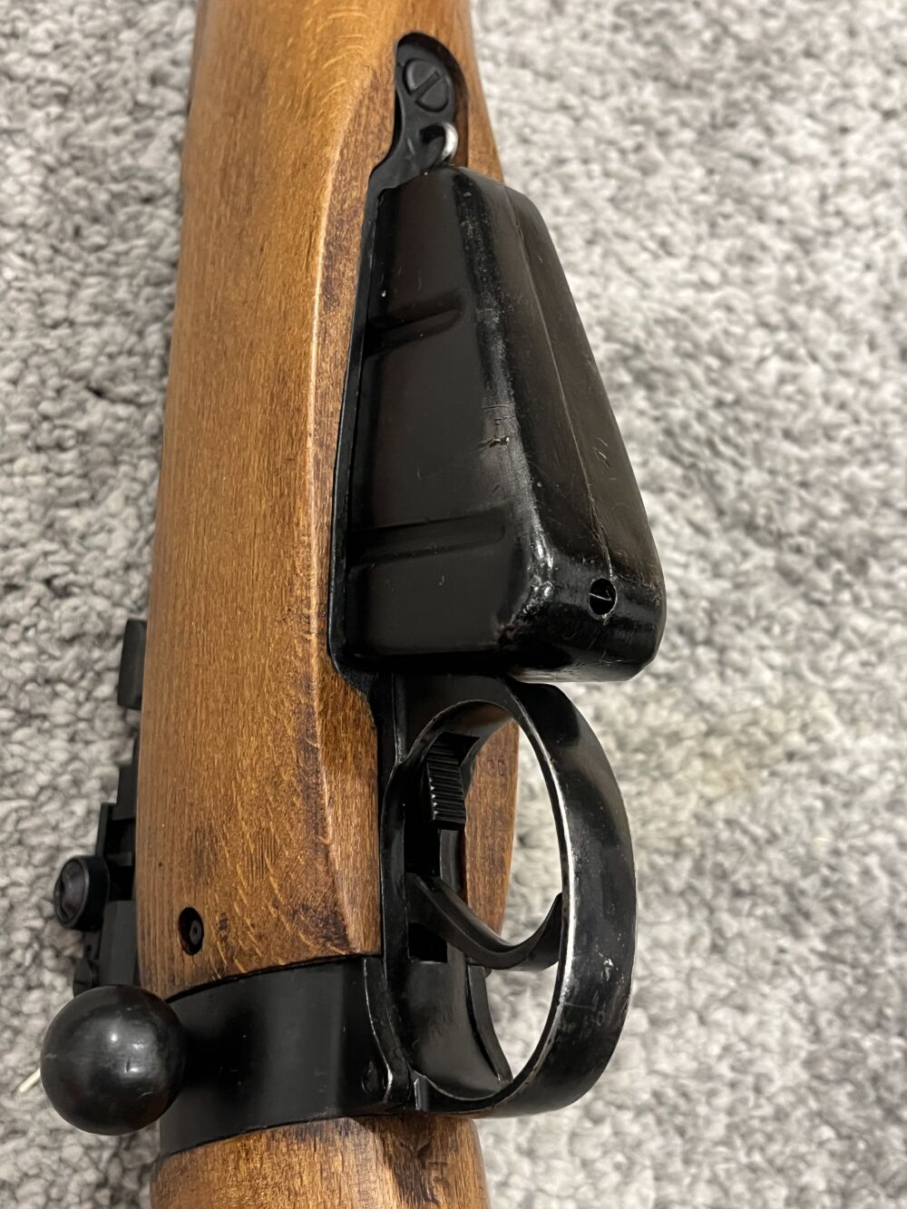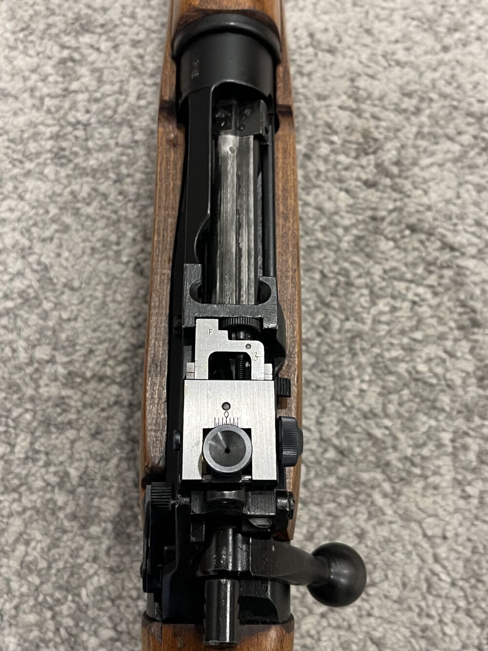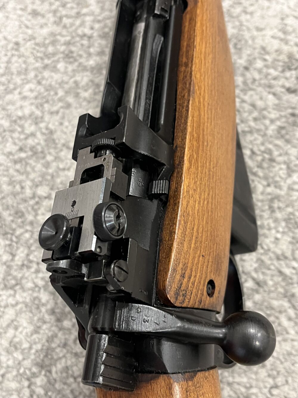 Zustand sehr gut bis neuwertig, vermutlich nie ausgegeben. Mittelbrauner Holzschaft mit Kolbenplatte aus Messing und Werkzeugfach. Original Diopter Visier, keine KWKG Änderung, alles intakt. nummerngleich inklusive Maga. Aufgesetzter Sportdiopter.