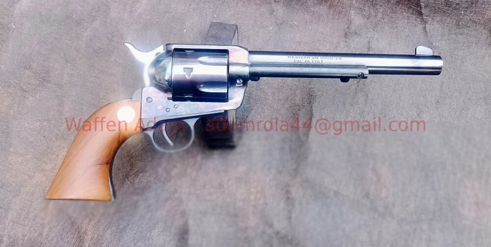 Colt SAA, Weihrauch,, Modell Six Shooter, Kal. 45LongColt. Blanker Lauf, 7,5" Lauflänge, glatte makellose Nussholz Griffschalen mit Firmenemblem in Gold. lNicht mehr gebauter Western Revolver in... ...weiterlesen