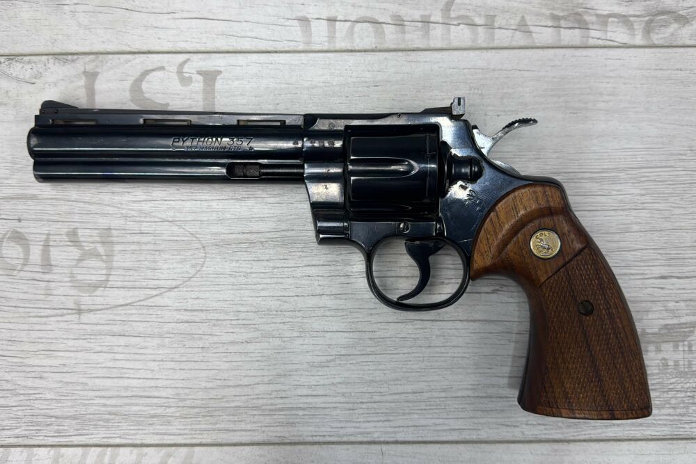 Der Colt Revolver Python 6" Kal.357Mag, Gebrauchtwaffe besitzt wie alle Colt Revolver eine extrem enge Passung zwischen Trommel und Lauf, eine ventilierte Laufschiene und ein lauflanges Ausstoßergehäuse. Python Läufe sind mit einem sachten Konus von Laufwurzel bis Mündungsende versehen, was die Präzision verbessern soll.