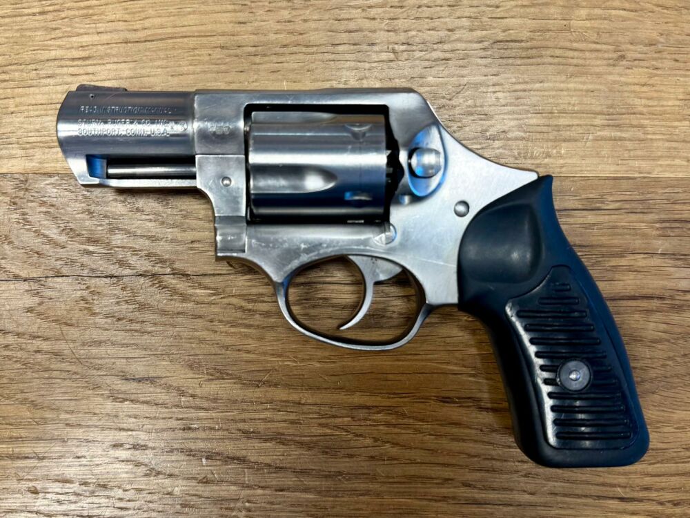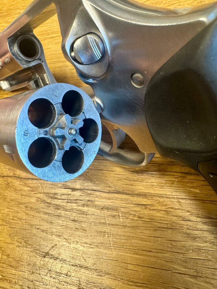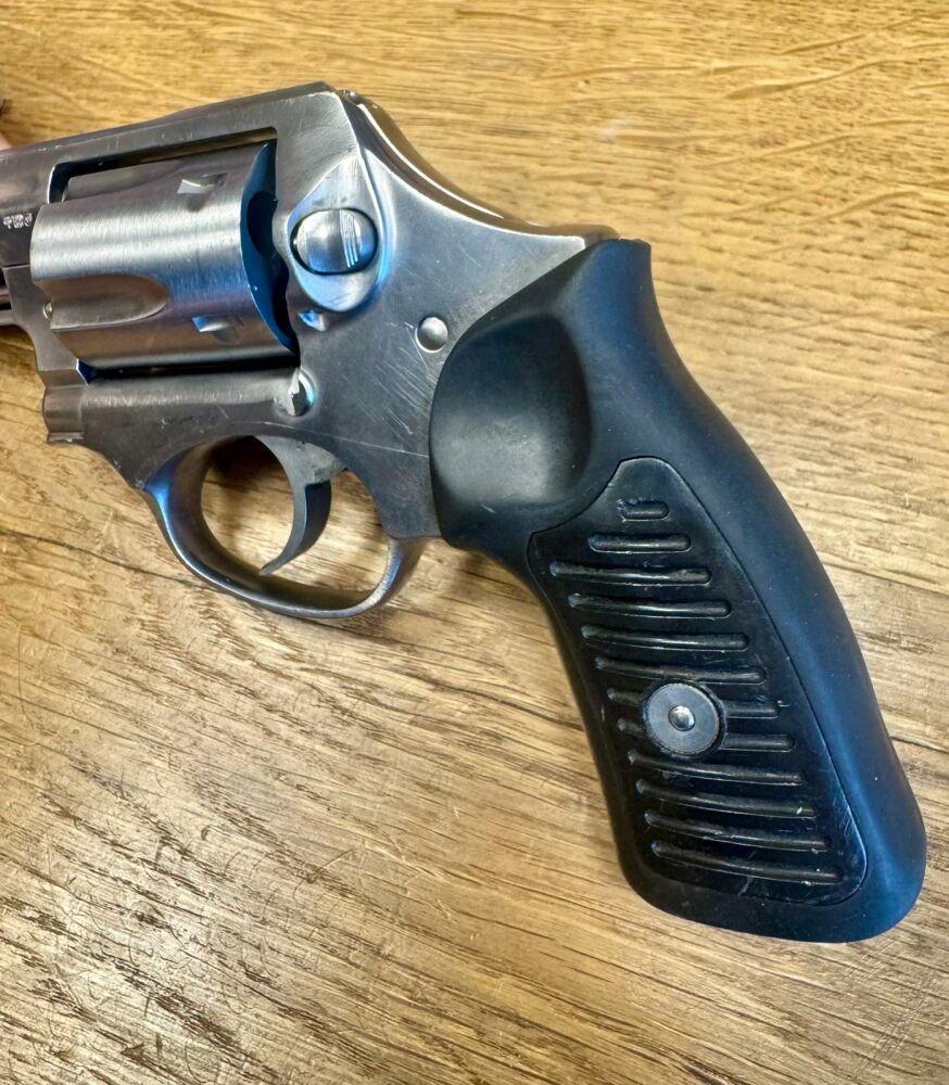 Der Revolver ha originale Kunststoffgriffschalen, und keinen außenliegenden Hammer.