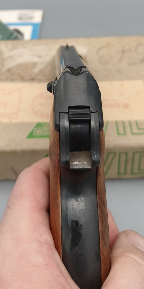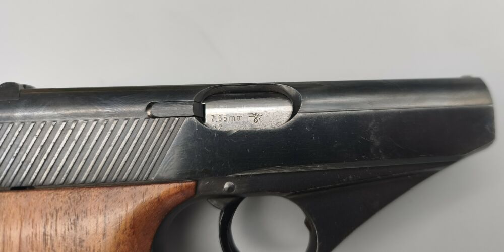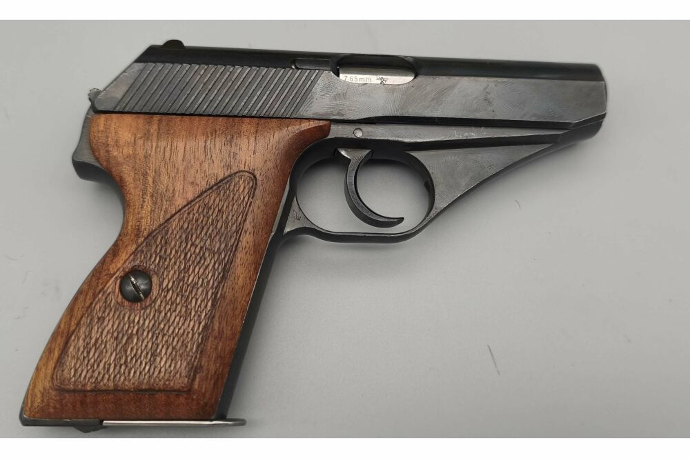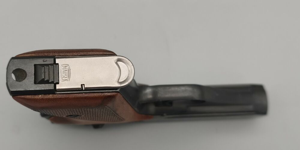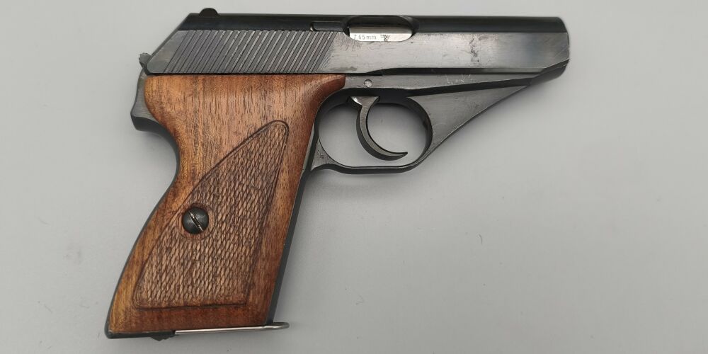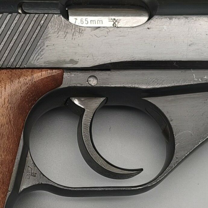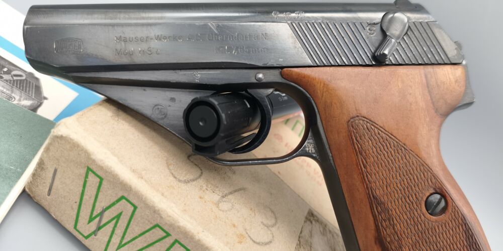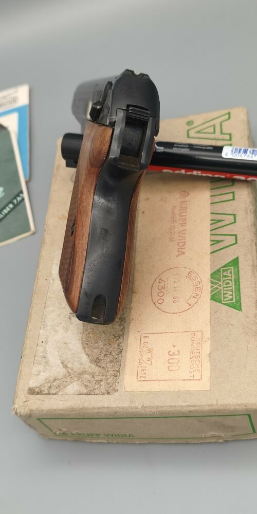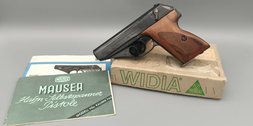 Mauser HSC in gutem gebrauchten Zustand. Hochglanz finish, am Griffrücken stumpf geworden, sonst gut erhalten. Holzgriffschalen ohne Risse. Eine Griffschalenschraube wohl neu. Magazin mit grauem Magazinboden. Inkl. der abgebildeten Box und der beiden Anleitungen. Die Box ist ursprünglich ein Versandkarton von etwas anderem gewesen. Eine anleitung scheint mir ein Reprint zu sein die andere Nachkrieg. Kam so aus Nachlass, daher wird das auch alles mitgeliefert. Die Fingerabdrücke auf der Brünierung hatte ich beim fotografieren nicht gesehen. Sind bereits abgewischt und haben die Brünierung nicht angegriffen. Mit Fangriemenöse. Die Waffe entspricht von der Bestempelung etwa der 3. Variante die hier dargestellt wird https://p38guns.com/HSc.htm. Allerdings mit zusätzlich dem Kaliber und dem Adler mit HK auf dem Lauf! Der Seriennummernbereich passt aber und die Stempel sind auch identisch. Vgl. auch https://www.tague.at/pistolen/index.htm?/pistolen/pages/mauserhsc.htm https://p38guns.com/HSc.htm