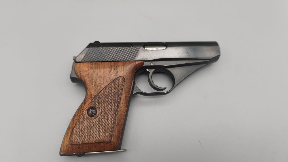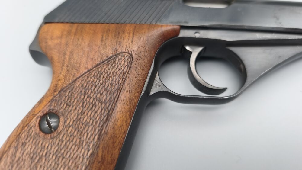 Mauser HSC in gutem gebrauchten Zustand. Hochglanz finish, am Griffrücken stumpf geworden, sonst gut erhalten. Holzgriffschalen ohne Risse. Eine Griffschalenschraube wohl neu. Magazin mit grauem Magaz... ...weiterlesen