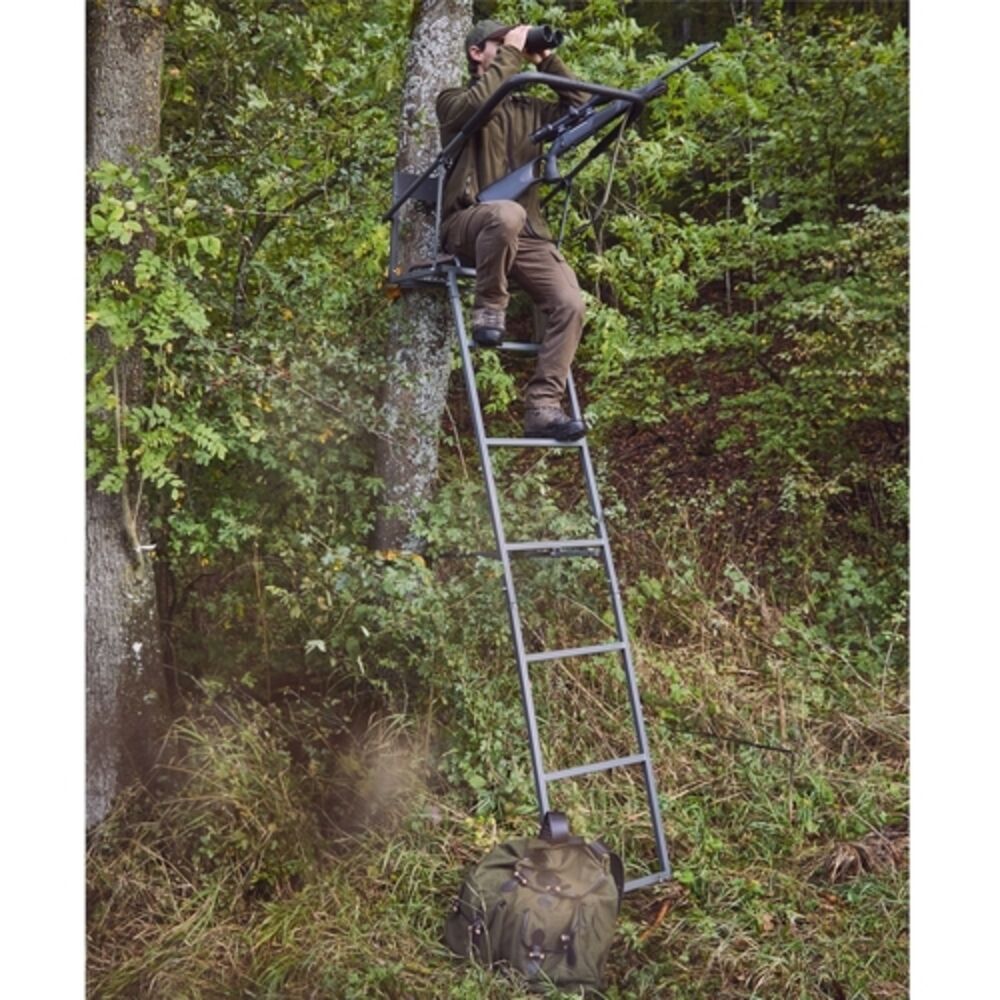 Der Hochsitz MST 250 aus einer robusten Stahlkonstruktion ist durch ein Stecksystem einfach und schnell aufzubauen. Ein Ratschengurt dient zur sicheren Fixierung, z. B. am Baum.