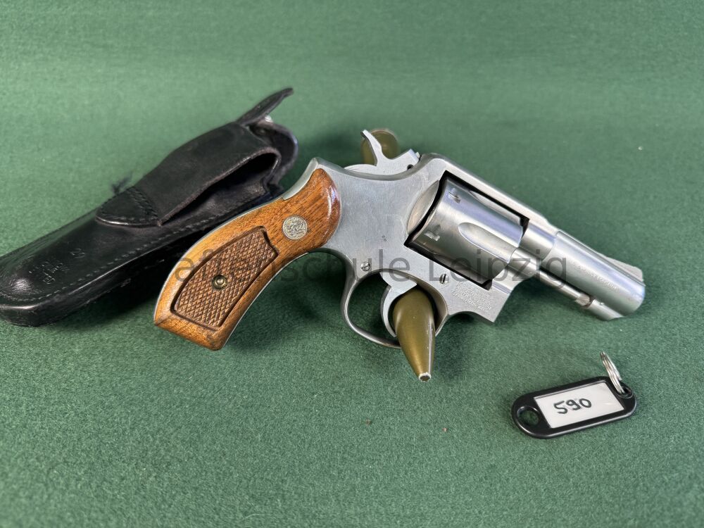 Revolver Kal. .357 Mag, Smith & Wesson, Mod. 65-5 DA, stainless, Lauflänge 3 Zoll, 6 Schuss Trommel, Holzgriffschalen, starre Visierung, Holster, div. leichte Kratzer ...weiterlesen